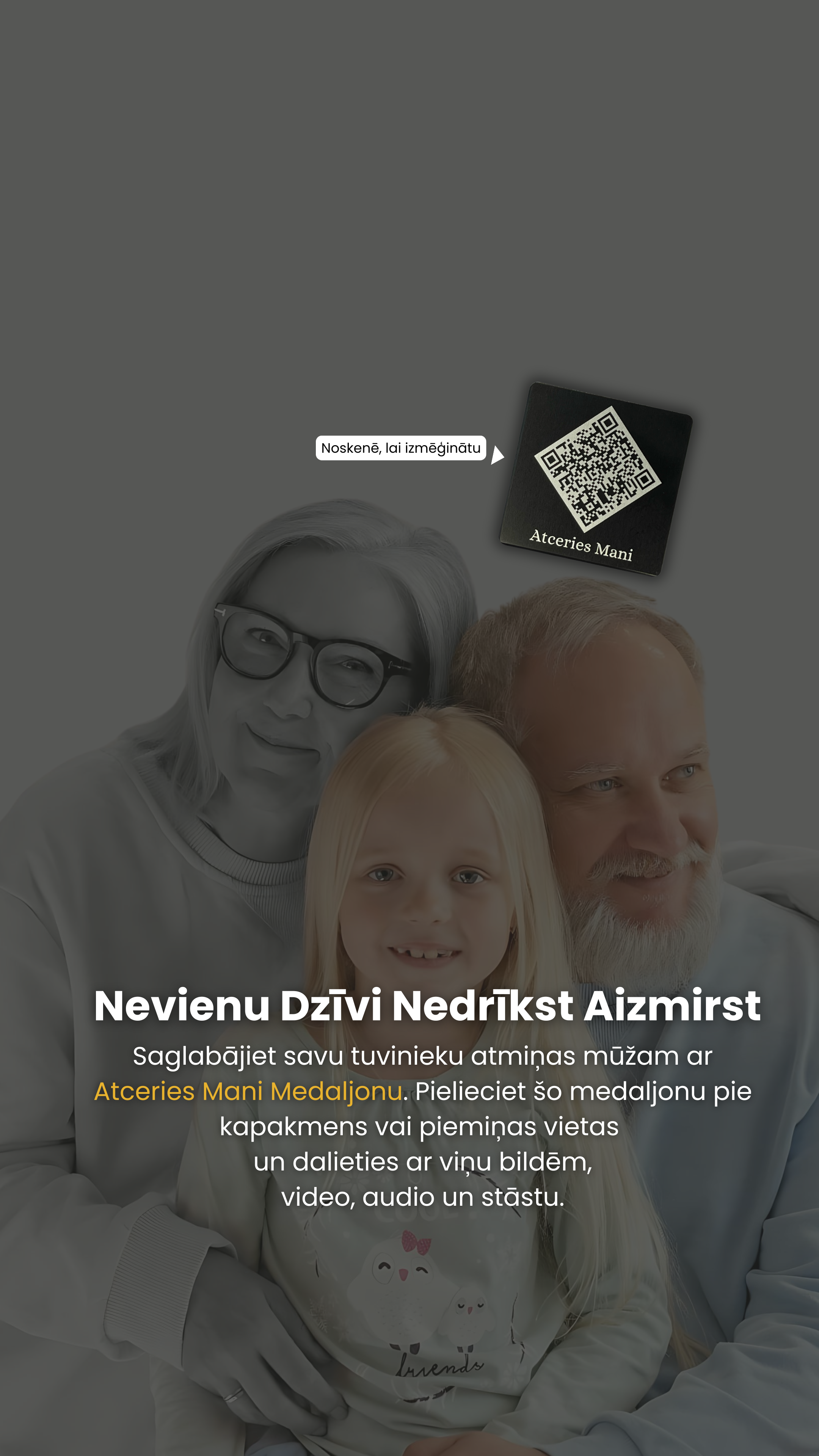 Atceries mani medaljons ir adonizÄta alumÄ«nija plÄksnÄ«te, kura ļauj sevi noskenÄjot apskatÄ«t jÅ«su izveidotu memoriÄla lapu. Veidota priekÅ” kapakmeÅiem un urnÄm, pieejama dažÄdos dizainos.